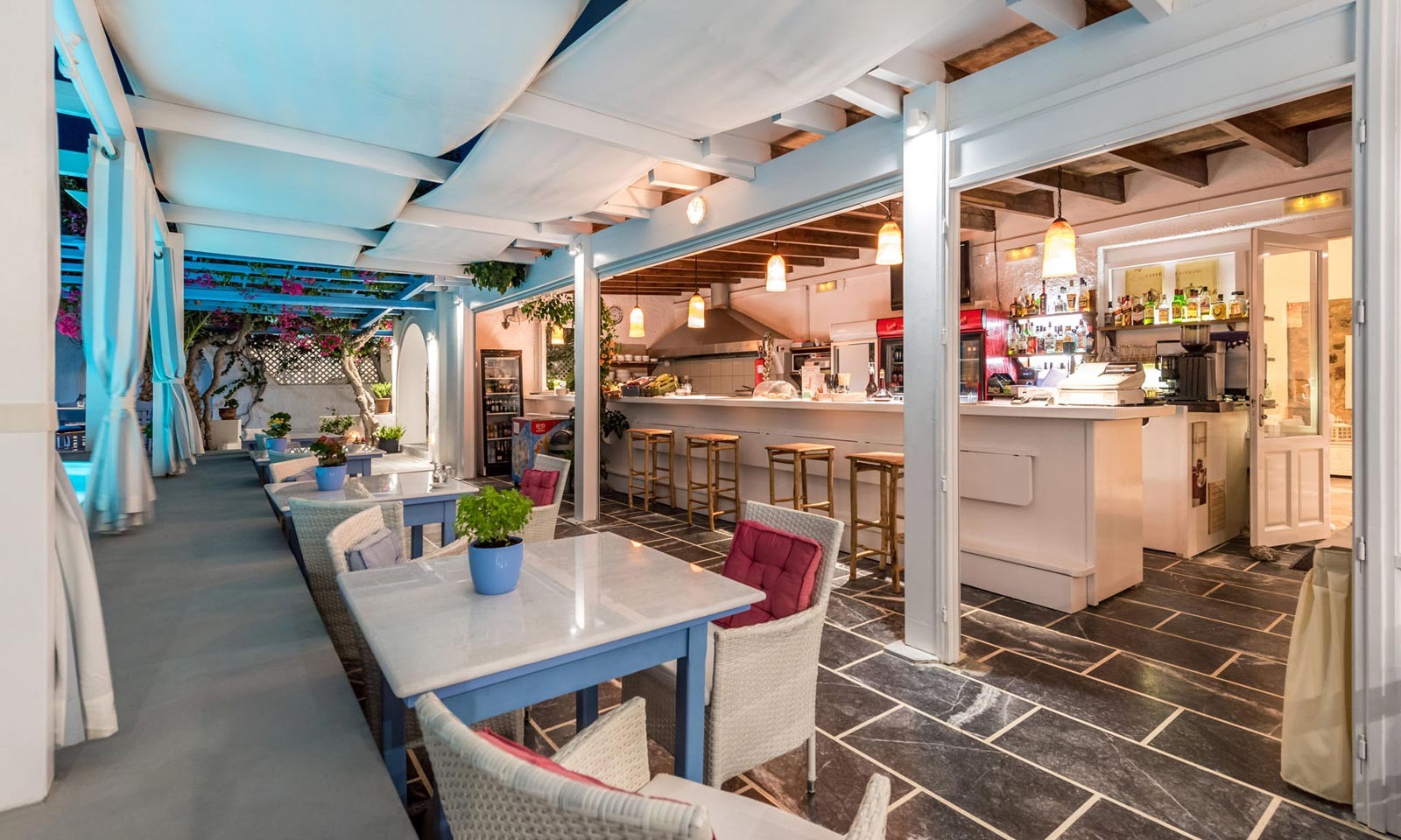 Our restaurant has been designed with a warm and contemporary feel, carefully designed to enable space. As the dining area is next to the pool on a terrace facing the endless blue of the Aegean, we have kept the traditional idea of a neighborhood yard, adjusting it to a quiet and relaxing ambience.